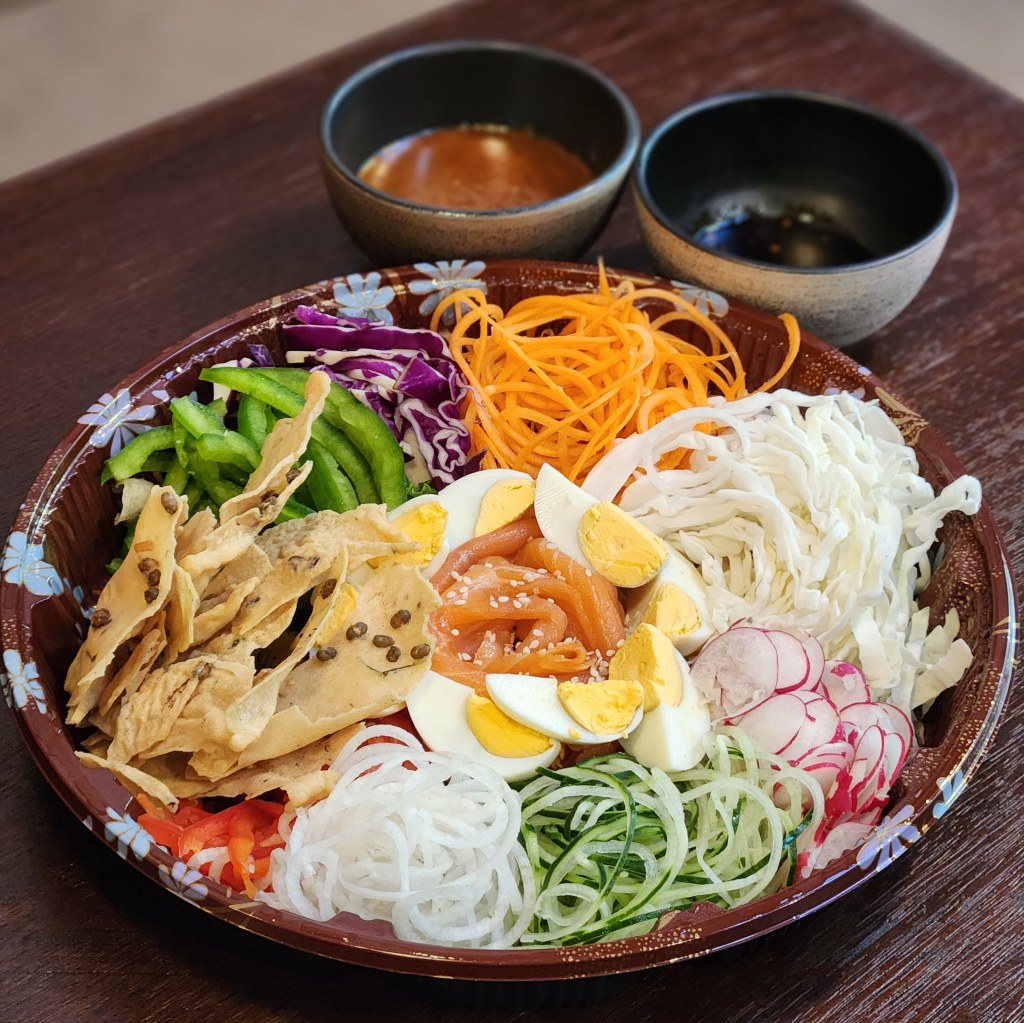 I found this unique & quite delicious⦠Petition to put this permanently on the menu as an option, please! They actually already have this on the regular menu as Pecel ($11.80+), but it comes with veggie sticks instead of thin veggies noodles.