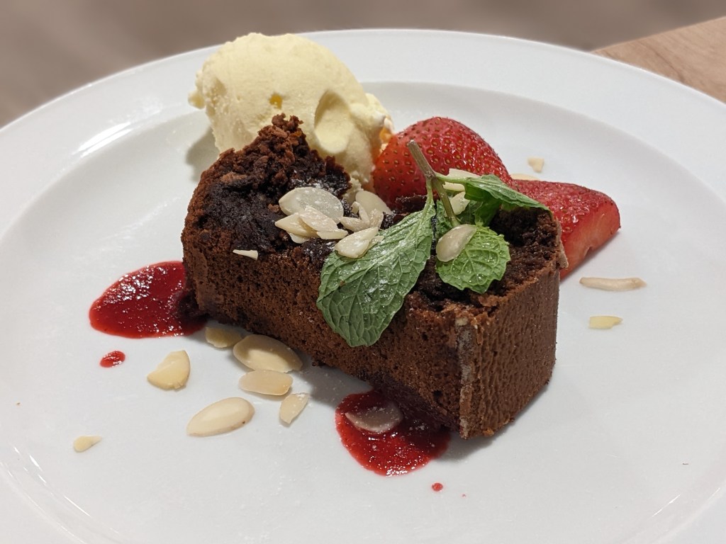 We wrapped up our night with a classic pairing of dark chocolate cake & vanilla bean ice cream.. With a slight twist: The cake is flourless. To be honest, when I first ate this from the outside in, I initially found this a little dry on the edges. However, when I got to the center, it was moist & delectable.