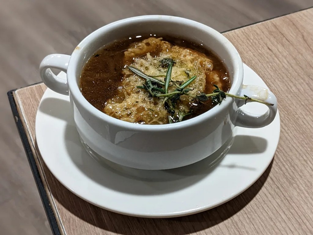 We started off our night with appetizers: 🔸 Baked Brie in Pistachio Crust, Pomelo Citrus Salad 🔸 French Onion Soup with Cheese Crouton