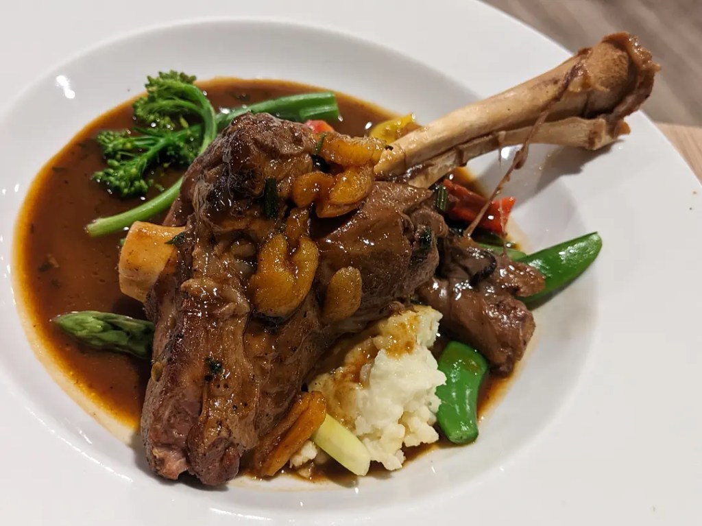 Baked Brie in Pistachio Crust, Pomelo Citrus SaladBraised Lamb Shank in Red Wine & Apricots, Mashed Potato & Seasonal Vegetables