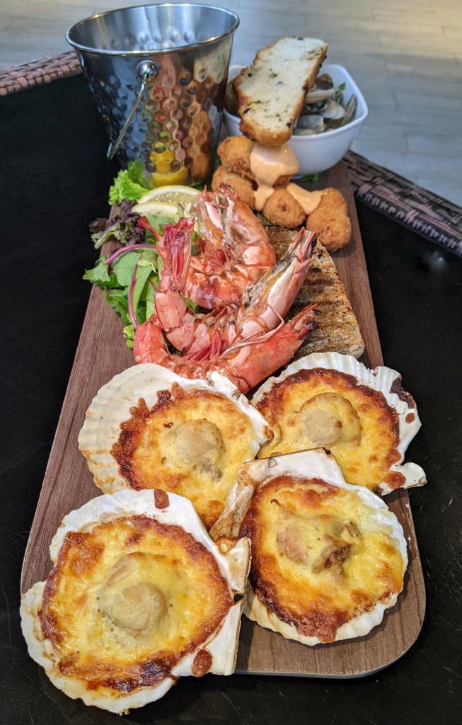 Good variety – grilled king prawns, barramundi fillet, short-neck clams in white wine sauce, baked scallops in half-shell, & salmon croquettes.